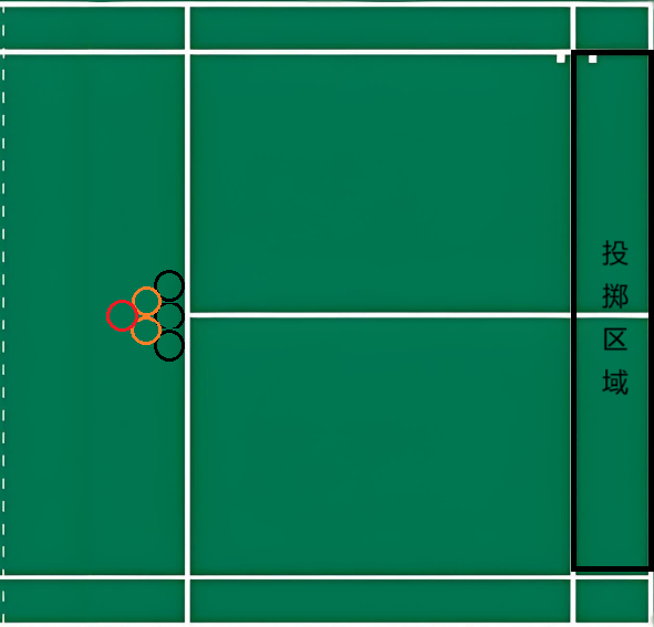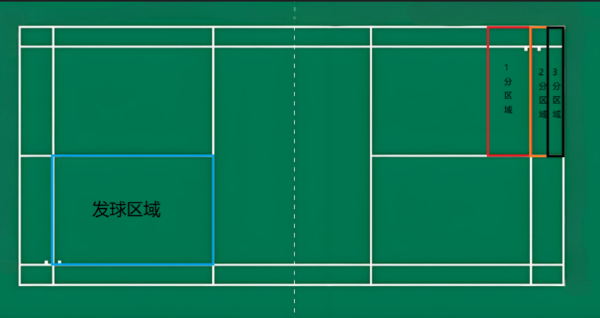 (1)定点入球:每名队员有5次发球机会,站在发球线后面(不可踩线),将球发至相应区域则获得相应分数(砸线则按照分高区域得分),发到区域外面则无分,计球头第一次落地位置。红色区域为1分,黄色区域为2分,黑色区域为3分。