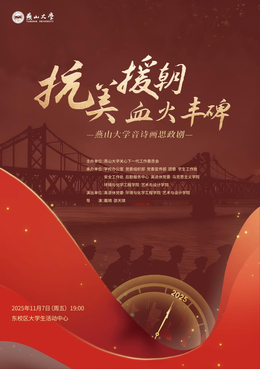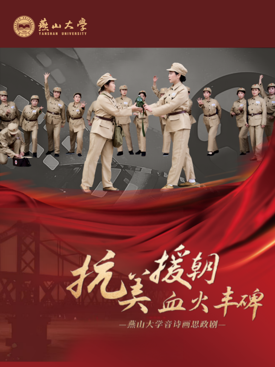 为弘扬抗美援朝精神,燕山大学关心下一代工作委员会倾力打造了《抗美援朝血火丰碑》音诗画思政剧,以艺术形式重现70余年前那段波澜壮阔的历史。具体信息如下: