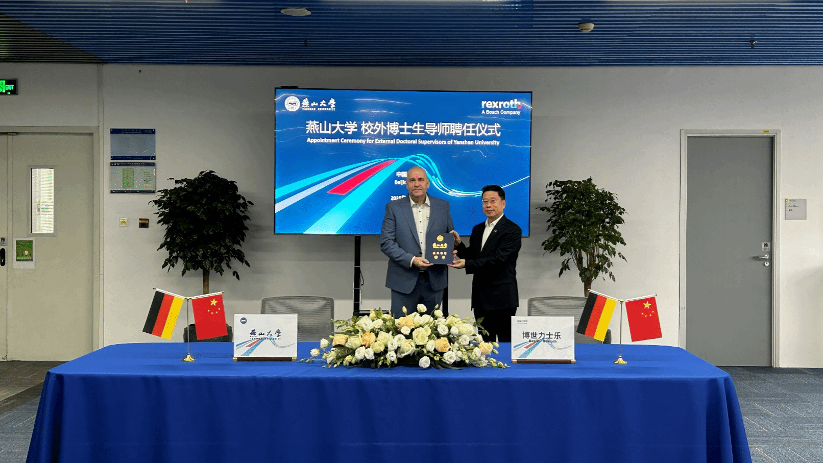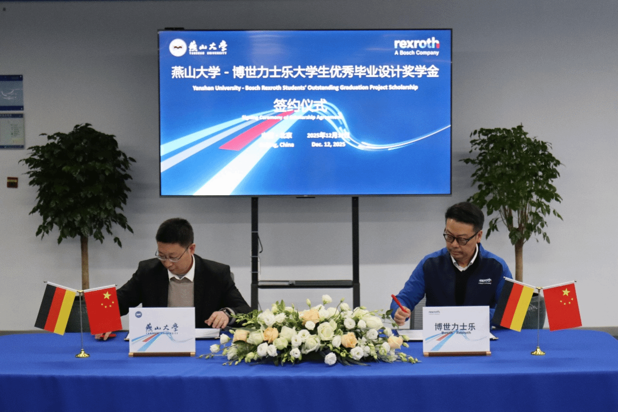 在与会人员的共同见证下,华长春与刘火伟代表双方签署了共建联合技术合作协议以及“燕山大学-博世力士乐大学生优秀毕业设计奖学金”协议。赵险峰为斯蒂芬·哈克、陈永伯(研发总监)颁发了燕山大学校外博士生导师证书。本次签约标志着校企双方合作进入新阶段,为后续人才培养、教育培训与科研合作等方面持续推进落地奠定了坚实基础。