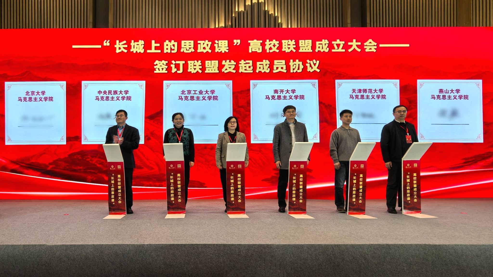 随后,国家文物局革命文物司展示传承处处长吴寒、燕山大学党委书记赵险峰、秦皇岛市人民政府副市长李国强、郑州大学学术副校长、马克思主义学院院长刘吕红、河北省文物局总工程师孙晶昌、河北省学校德育工作中心主任蔡杭州、河北省民族事务委员会文化教育科技处处长姚秀平等共同启动联盟。北京大学马克思主义学院副院长陈培永宣读《“长城上的思政课” 高校联盟致全国高校倡议书》,号召成员高校携手挖掘长城精神内涵,打造“行走的思政课”育人品牌。来自北京大学、中央民族大学、北京工业大学、南开大学、天津师范大学、燕山大学、山西大学、内蒙古大学、东北大学、吉林大学、哈尔滨师范大学、山东大学、郑州大学、榆林学院、兰州大学、青海大学、宁夏大学、新疆大学、石河子大学、塔里木大学等20所发起高校的马克思主义学院代表共同签署联盟发起成员协议,标志着这一跨区域、跨院校的思政课协同育人平台正式启航。