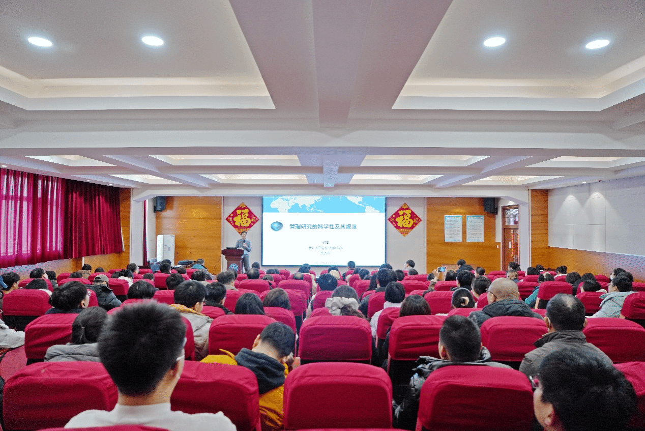 张维教授以《管理研究的科学性及其规范》为讲座题目,结合自己多年的学术研究,从管理学科学术研究的目的及规范出发,从学科的形成、科学研究的一般性与特殊性、科学研究的基本过程、研究的选题、研究的方法等六个方面,深入浅出地介绍了如何选择有研究意义的科研选题和如何开展高水平学术研究。他提出,管理科学是一种“实践”,是为了有效地实现人类或有人类参与的社会组织功能及其目标的一类实践活动。管理科学的研究问题更多地来源于管理实践中的问题,是对于某种科学“规律”的探索,是与“现象”相关的“核心概念”的构造、测度、以及对这些概念之间因果逻辑关系的探索。管理科学研究的选题应立足于管理实践需求和科学研究者的兴趣,做到“源于生活,高于生活”。