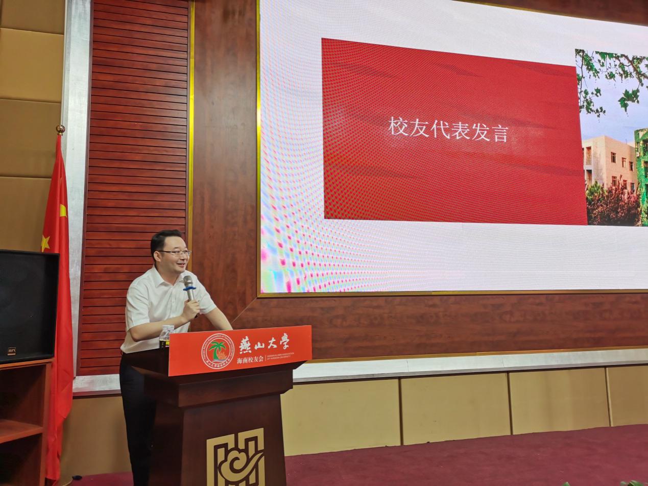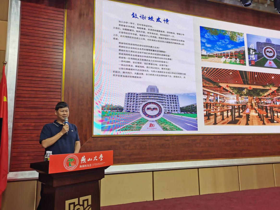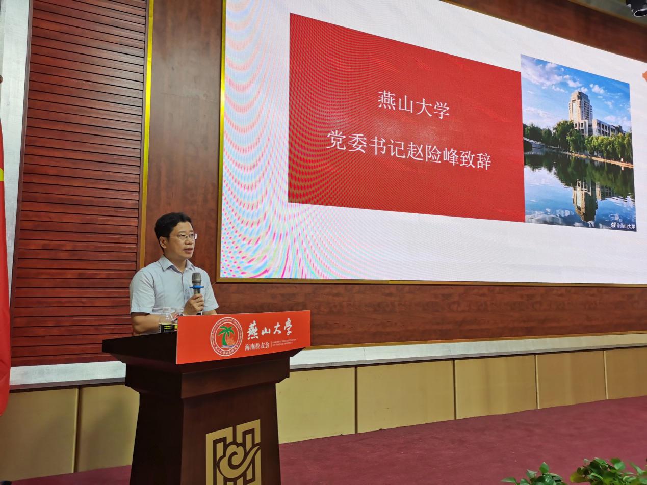赵险峰代表全校四万余名师生员工以及海内外广大校友向海南校友会的正式成立表示热烈的祝贺。他指出,去年上半年,学校成功召开了第四次党代会,确立了跻身国家“双一流”建设高校行列的近期发展目标和建设“特色鲜明、国内一流、世界知名研究型大学”的中长期发展目标。去年下半年,教育部副部长翁铁慧、省委书记王东峰、省长许勤、副省长徐建培等先后来校调研,表示全力支持学校加快“双一流”建设。今年年初,省委、省政府出台了支持燕山大学加快“双一流”建设、实现内涵式高质量发展的专门文件。目前全校上下和广大校友精神振奋、干劲十足,正朝着既定目标只争朝夕、砥砺奋进。他代表学校对校友工作提出三点建议:一是聚力量,增强校友的归属感、责任感;二是加强建设,促进校友会运行规范化、制度化;三是着眼大局,发挥校友会在母校发展中的推动作用。他号召广大校友发扬熔铸在骨子里的奋斗基因、工匠精神、卓越品质和家国情怀,为学校早日跻身国家“双一流”建设高校行列奋力拼搏,为实现中华民族伟大复兴的中国梦作出新的更大贡献。他邀请各位校友在百年校庆之际重返母校,畅叙情谊,共襄盛举。