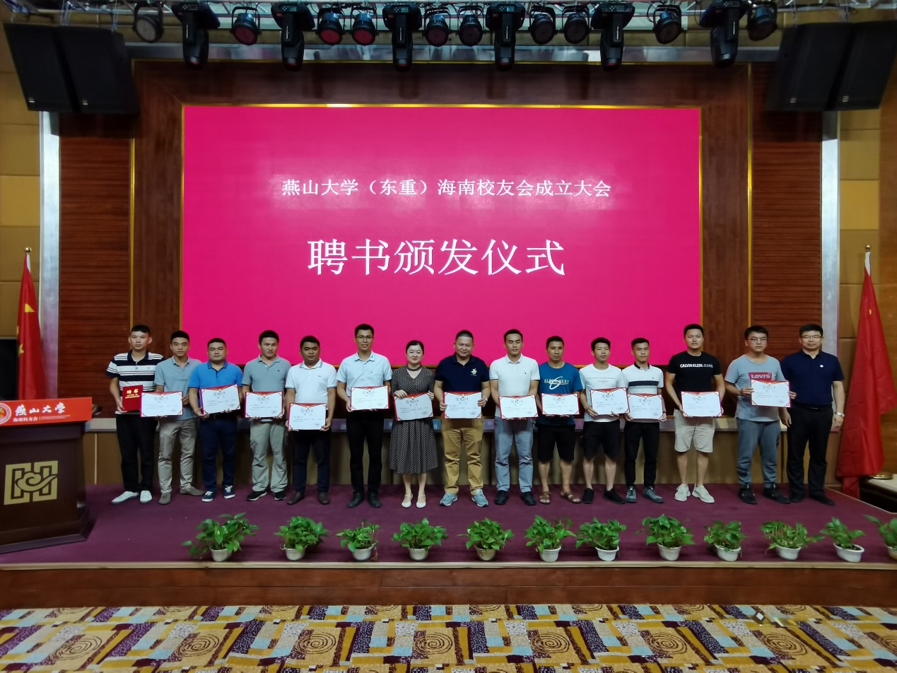 赵险峰向海南校友会代表授旗,王跃华为燕山大学(东重)海南校友会主席、理事颁发聘书。