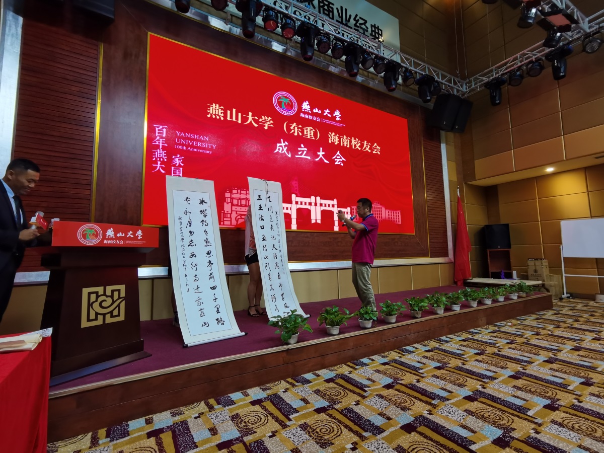 太平洋建设首席营运官、庄严系董事局主席、03音乐北京校友金亮,深圳校友会理事、检测84校友詹四平,北京校友会常务副会长、轧钢88校友武永胜和90级工企专业校友杨国理分别发言,表达了对海南校友会的祝福。兄弟校友会还向海南校友会赠送了书法作品。