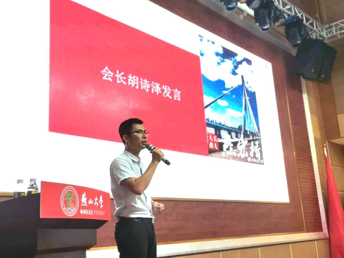 02级电子专业、海南返乡大学生志愿服务队创始人、新竹镇次滩观光旅游合作社理事长、海南校友会会长胡诗泽发言,表示海南校友会要维护好各地校友与母校的情感纽带,做好服务校友工作。