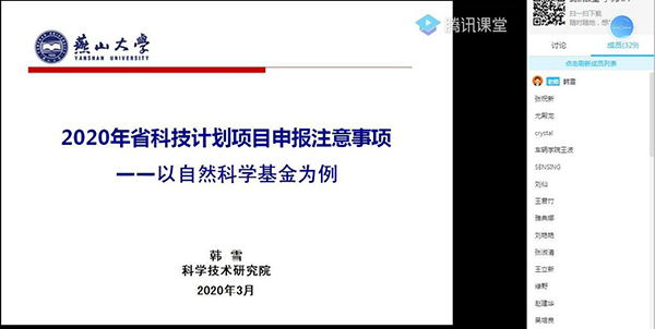 【新闻中心讯】为确保疫情防控形势下,学校科研管理组织工作有效有序进行,切实做到“疫情防控不松懈、教学科研不停步、改革发展不放松”,3月2日晚,科学技术研究院组织全校相关学院和老师,以网络直播的形式举办“2020年河北省科技计划项目申报事项说明会”。