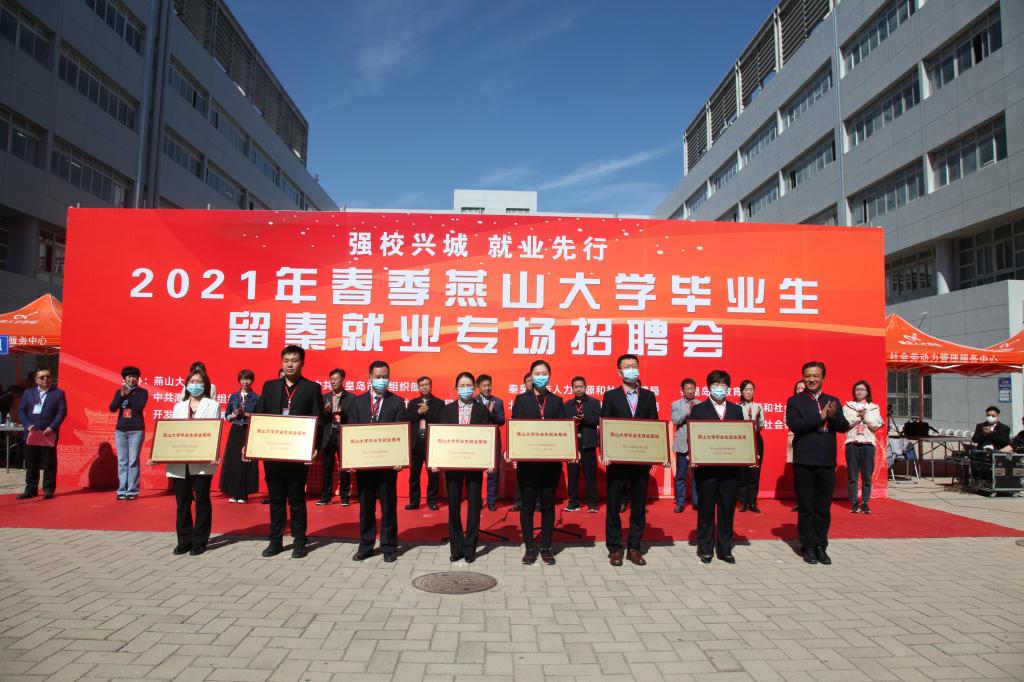 在招聘会启动仪式上,还举行了“秦皇岛市人才输送基地”揭牌和“毕业生就业基地”授牌仪式。燕山大学招生就业处处长张红兵和秦皇岛市人力资源和社会保障局三级调研员杨金龙共同为人才输送基地揭牌,张红兵向中冶沈勘秦皇岛工程设计研究院有限公司等七家重点合作企业颁发了就业基地牌匾。
