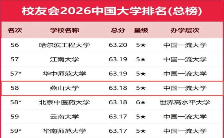 【新闻中心讯】1月12日,全国第三方大学评价研究机构艾瑞深校友会网(Cuaa.net)正式发布校友会2026中国大学排名。榜单显示,我校居校友会中国大学排名(总榜)第58位,较上一年度前进3位,星级排名为5星级,办学层次为中国一流大学。
