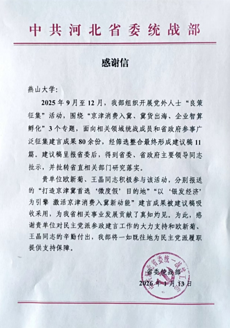 【新闻中心讯】1月13日,中共河北省委统战部发来感谢信,对学校大力支持民主党派参政建言工作表示高度肯定与诚挚感谢。信中特别指出,我校民主党派成员提交的两份建言成果被吸纳采用,为河北省经济事业发展贡献智慧力量。这不仅彰显了燕山大学在服务地方发展中的责任担当,也凸显了统一战线在凝聚智慧、推动决策中的重要作用。