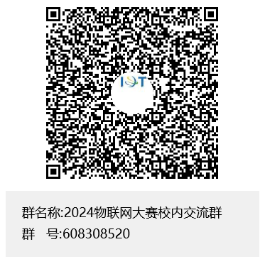 1.报名资格审核:即日起开始报名,到2024年4月30日截止,竞赛不收取任何报名费。报名参赛同学请在学校创新创业竞赛系统搜索(一类校赛)全国大学生物联网设计竞赛校内选拔赛(竞赛编号5-342)进行报名。报名参赛同学加入QQ群(群号:608308520。群名:2024物联网大赛校内交流群),修改昵称备注(格式:姓名-学院-专业)。具体参赛要求及后续事项等将通过QQ群发布,不再另行通知。