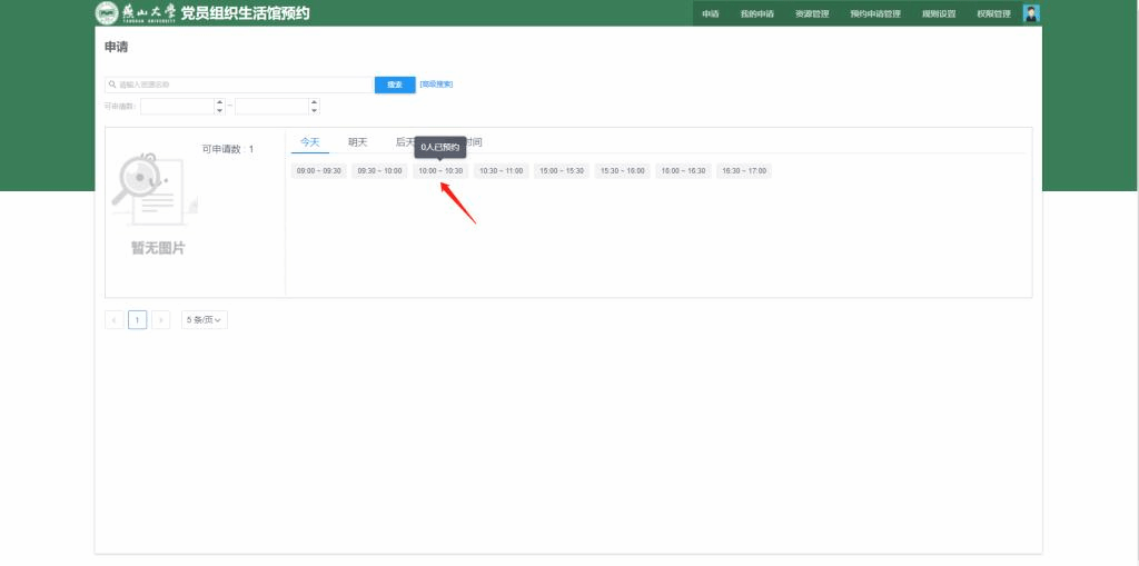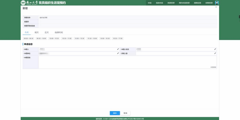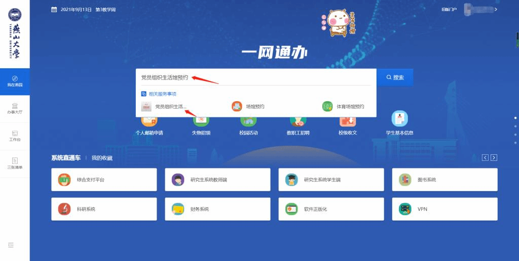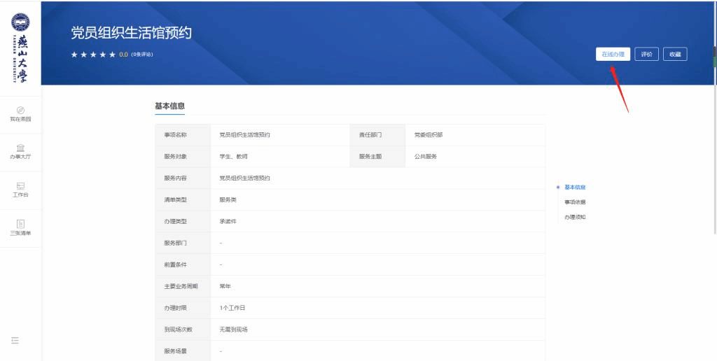 通过燕山大学门户导航“一网通办”即可打开“一网通办”服务平台首页(或直接访问https://ehall.ysu.edu.cn)。在搜索栏输入“党员组织生活馆预约”,进入服务事项,点击“在线办理”进入服务,选择预约日和预约时段并填写预约相关信息,点击保存按钮。