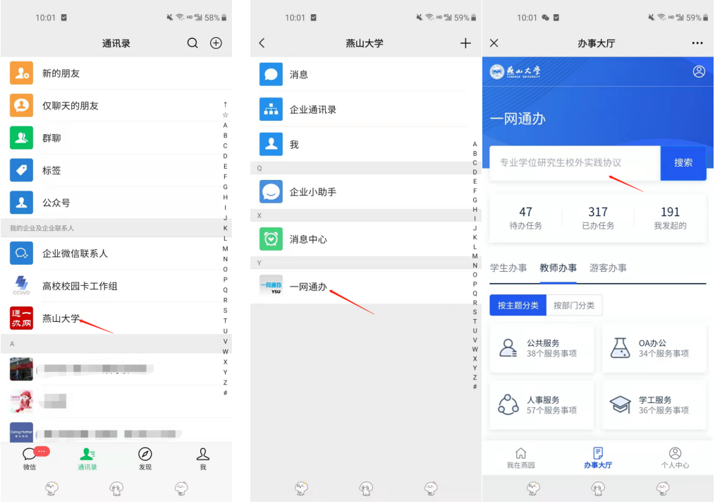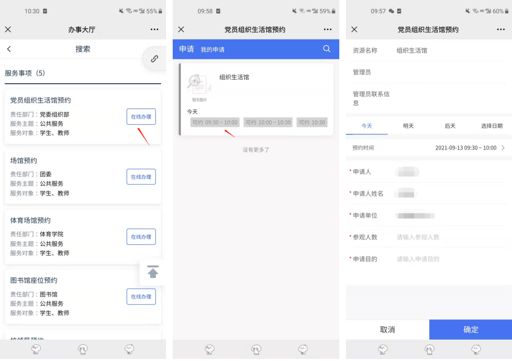 已经关注燕山大学微信企业号师生(未关注的详见通知http://notice.ysu.edu.cn/info/2073/9049.htm进行操作),在“通讯录”——“我的企业及企业联系人”点击“燕山大学”,进入企业号。点击“一网通办”,进入服务,在搜索中输入“党员组织生活馆预约”,点击“党员组织生活馆预约”对应的“在线办理”进入服务,选择预约日期和预约时段登记预约相关信息点击确定按钮。