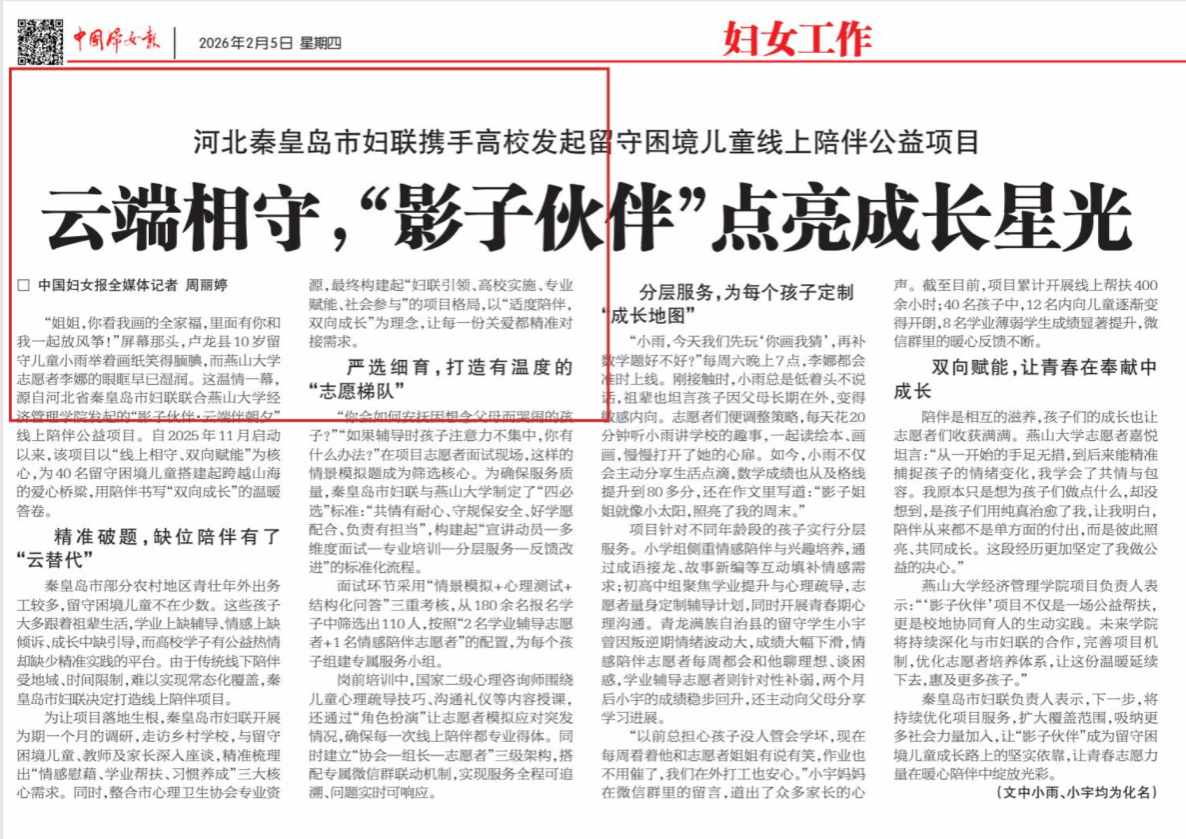 【新闻中心讯】近日,由我校与秦皇岛市妇联联合发起的“影子伙伴·云端伴朝夕”线上陪伴公益项目受到《中国妇女报》关注并报道,该项目由经济管理学院率先发起,以“线上相守、双向赋能”为核心,不仅为留守儿童送去温暖与陪伴,更成为校地协同育人、践行青年社会责任的生动实践,获得社会各界广泛认可。